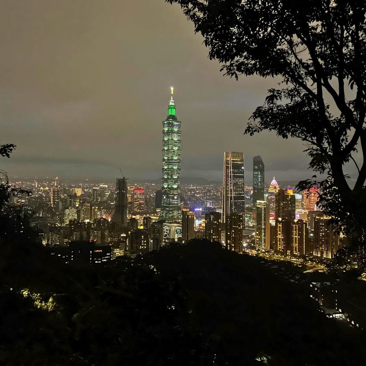 The contrast between the darkening cityscape and the glowing skyscraper was breathtaking. Standing there, looking up at Taipei 101 from a mountaintop, felt strangely surreal—a building taller than the peak I had just climbed.
